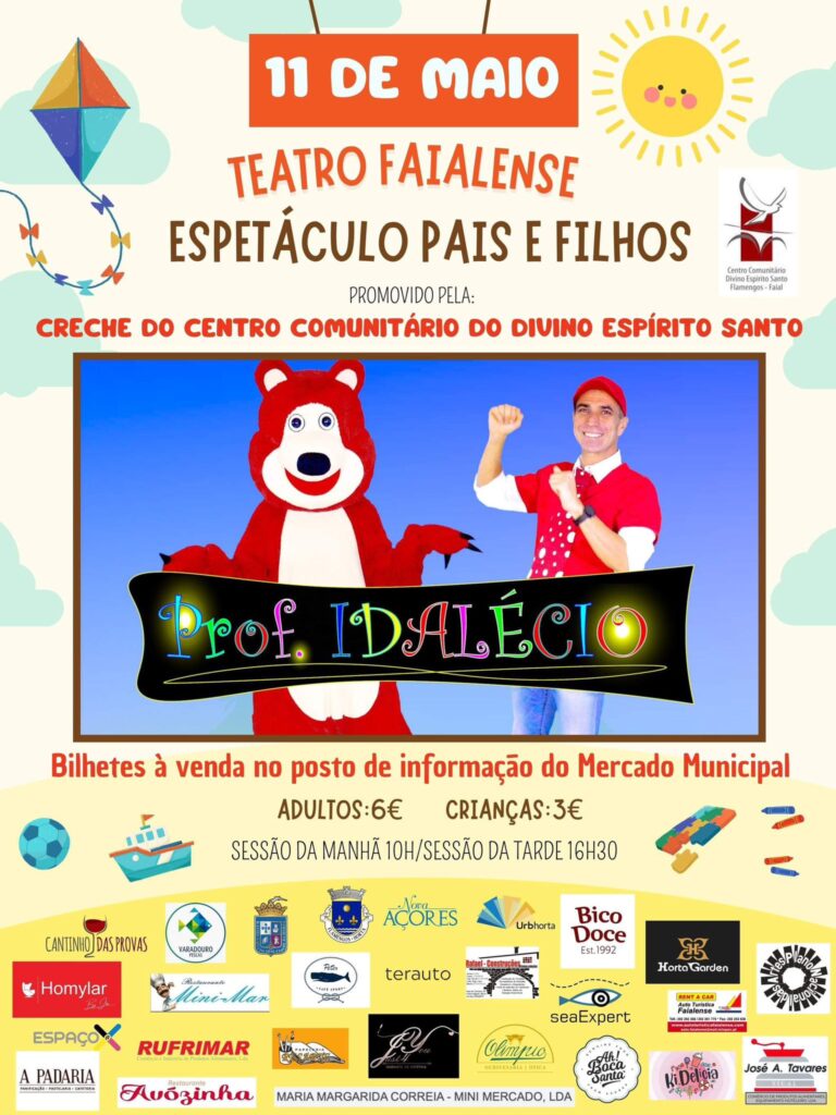 Próximo dia 11 de maio no teatro Faialense ocorrerá o Espetáculo Pais e Filhos, promovido pela Creche do Centro Comunitário do Divino Espírito Santo com o artista de música infantil Prof. Idalécio.